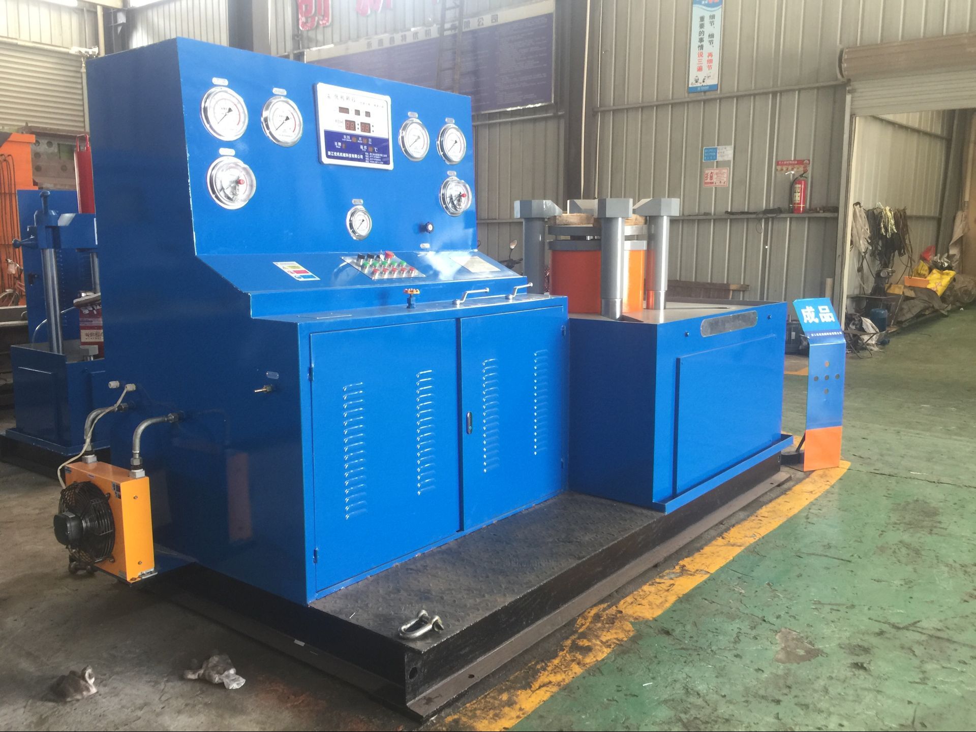 三、接通電源,按油泵啟動按鈕,檢查電機轉動方向,是否正確(順時針方向)進行5 — 10分鐘空載運轉后,調節油泵壓力在5 0MPa進行試機,各種動作,檢查各管路有無泄漏,發現不良現象,應立即停機排除。