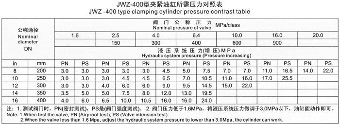 5.4 JWZ-400型 (特制型)閥門公稱通徑與公稱壓力試驗(yàn)范圍
